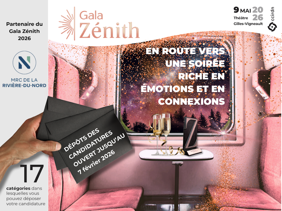 Partenaire du Gala Zénith 2026, la MRC de La Rivière-du-Nord s’associe à la CCIRDN pour célébrer les organisations qui contribuent activement à la vitalité économique de notre région.